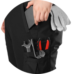 • 500 Denier Oxford fabric reinforces the pocket edges, gussets, knees, kick panels, and seat, providing exceptional durability for tough tasks.