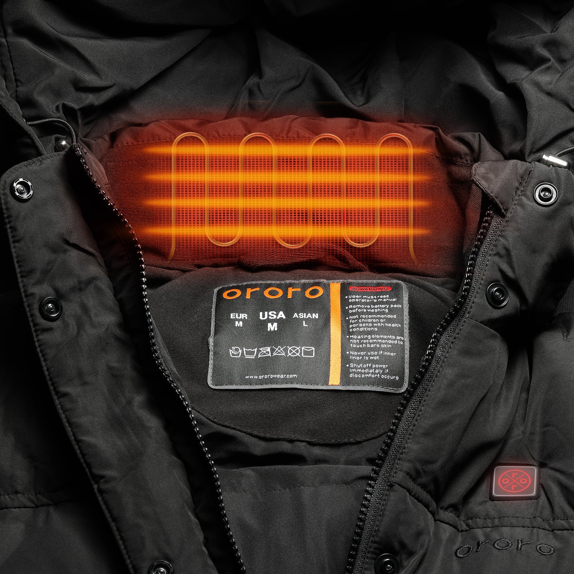- 4 carbon fiber heating elements generate heat across core body areas (left & right pocket, collar, upper back);